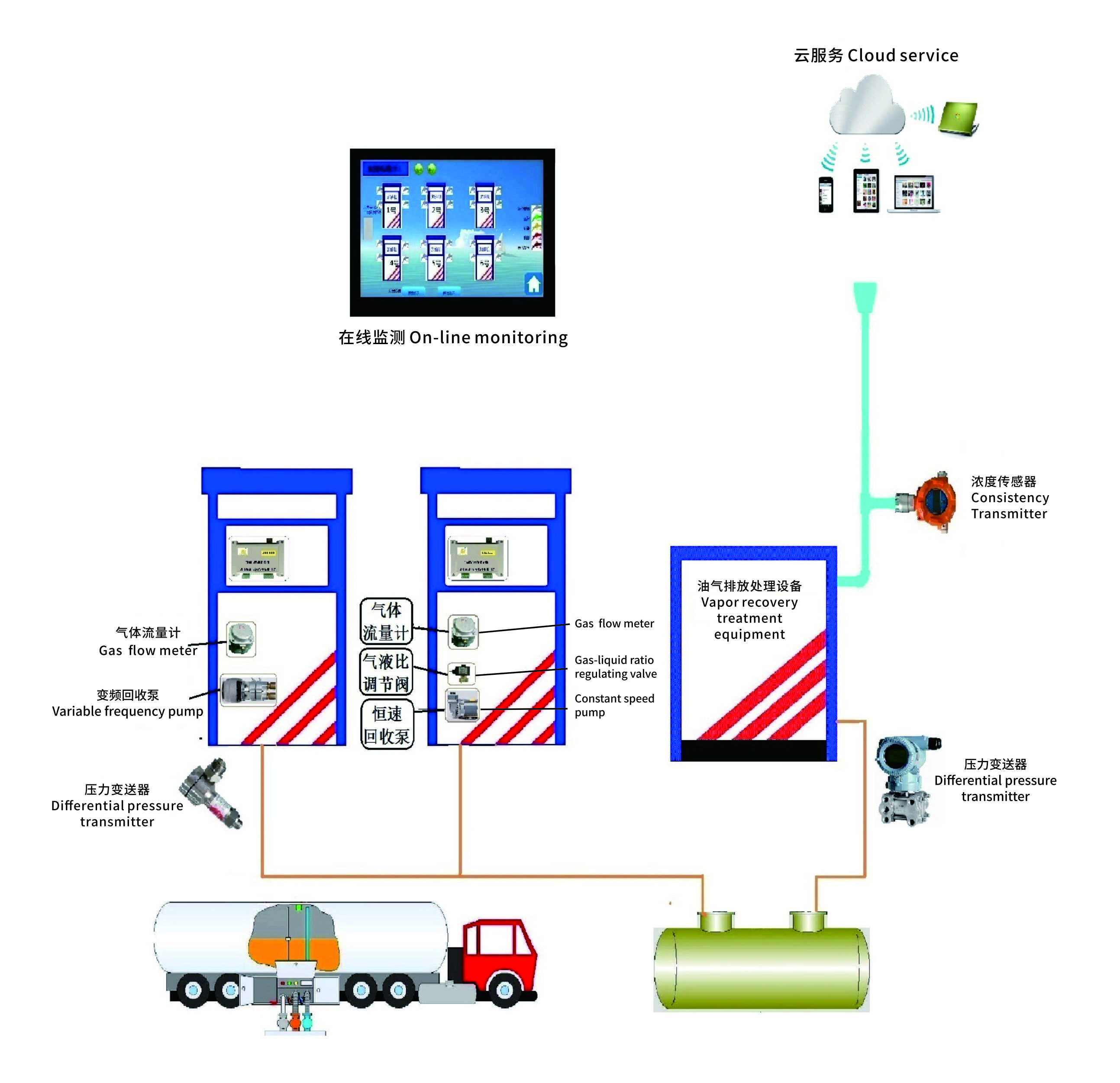 油氣回收在線監(jiān)測(cè)系統(tǒng):對(duì)卸油時(shí)是否連接回氣管、汽油加油槍氣液比、油氣回收系統(tǒng)壓力、油氣排放裝置是否處于正常狀態(tài)等4個(gè)指標(biāo)進(jìn)行監(jiān)控,具備數(shù)據(jù)儲(chǔ)存、上傳和氣液比報(bào)警后自動(dòng)關(guān)閉加油槍的功能。并具備油氣回收系統(tǒng)密閉性、油氣回收管線液阻的監(jiān)測(cè)功能。